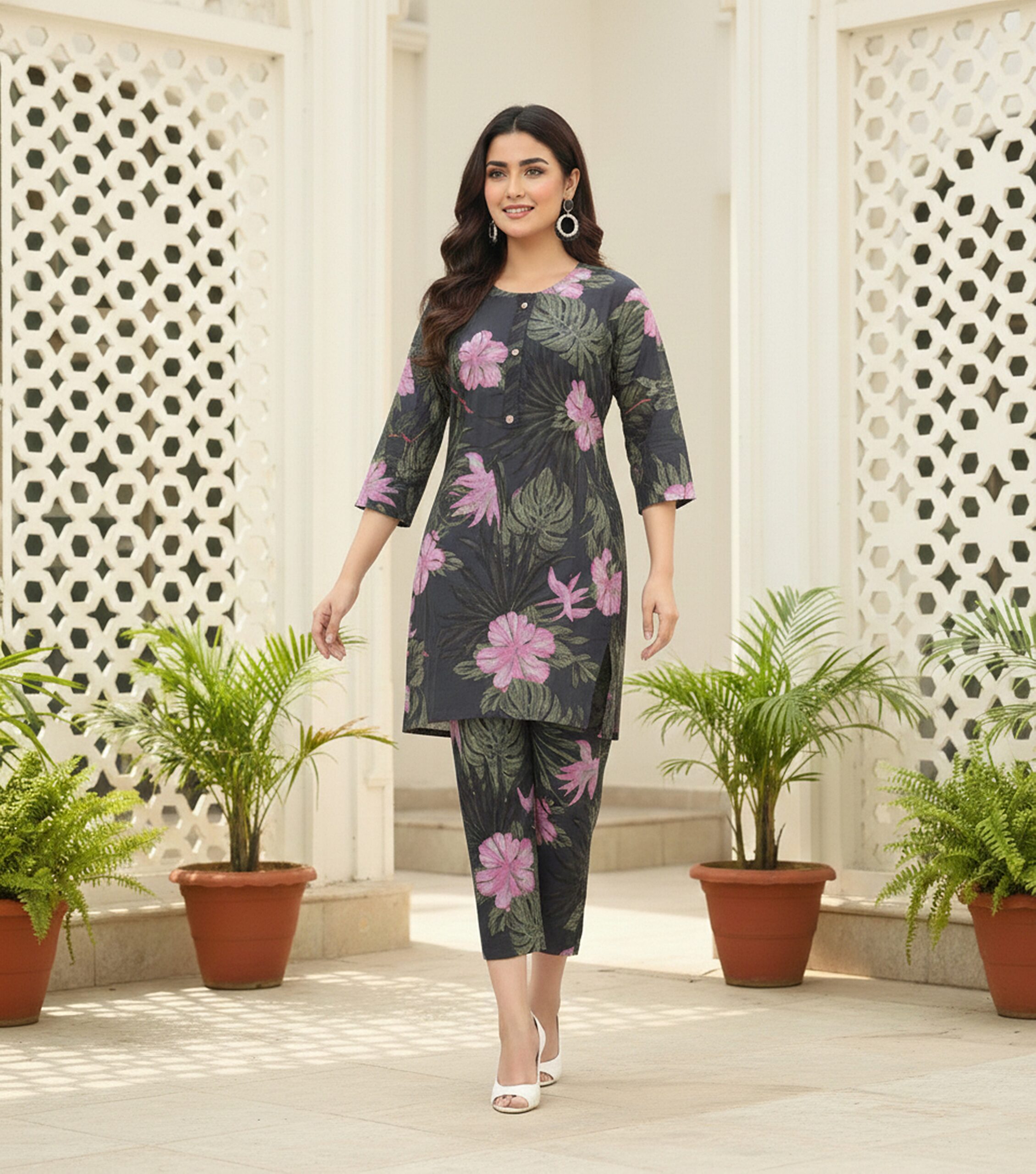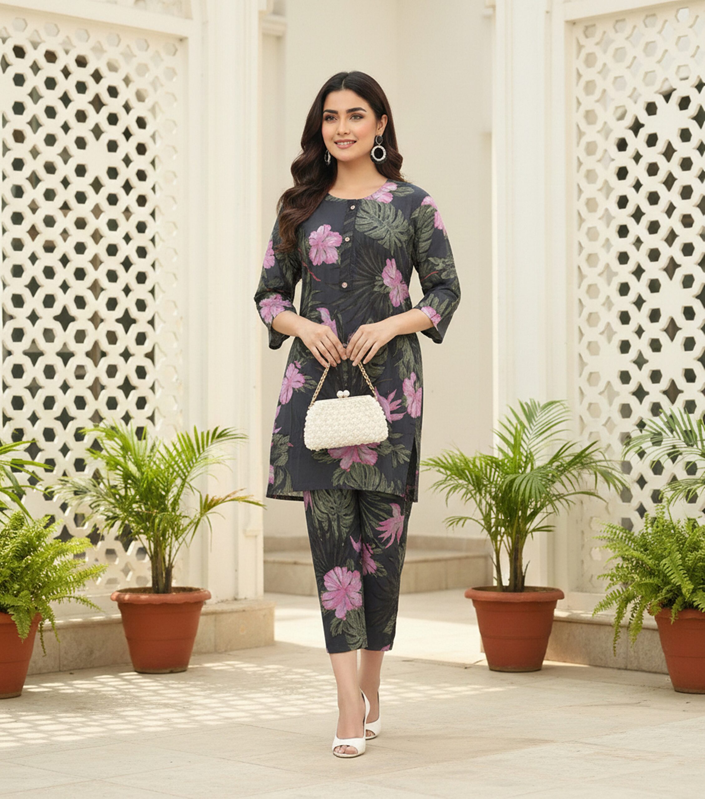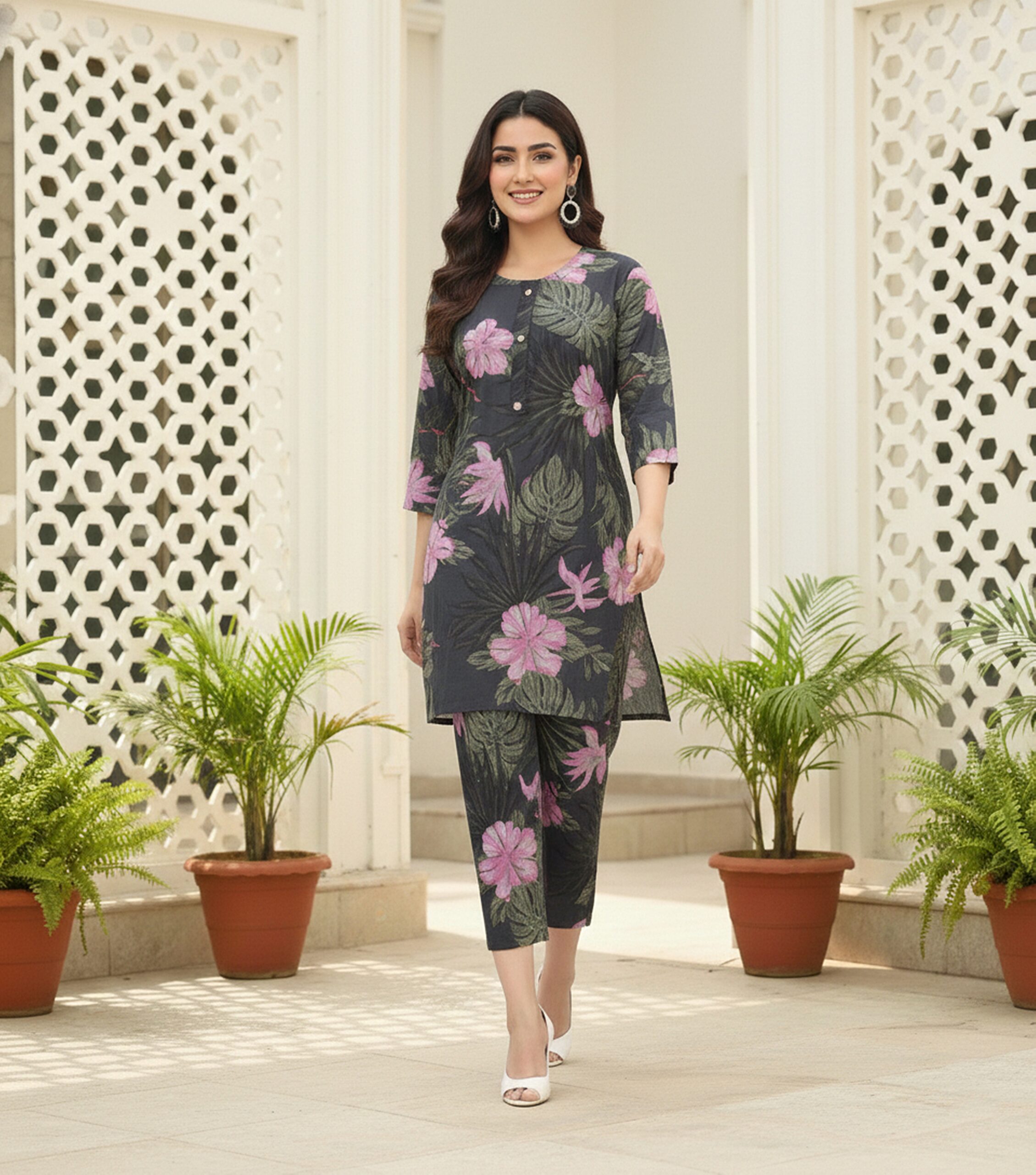 Our Boski Linen 2-piece suit in grey features a beautiful floral print, designed to bring a fresh and stylish touch to your summer wardrobe. Made from premium, breathable linen fabric, this set includes a shirt and matching trousers, offering a relaxed fit and exceptional comfort for warm-weather days. The soft grey color provides a subtle, sophisticated backdrop, while the floral print adds a lively and elegant accent. Perfect for casual outings, semi-formal events, or summer gatherings, this floral-printed Boski Linen suit combines timeless design with breathable fabric, ensuring you stay cool and chic all summer long.