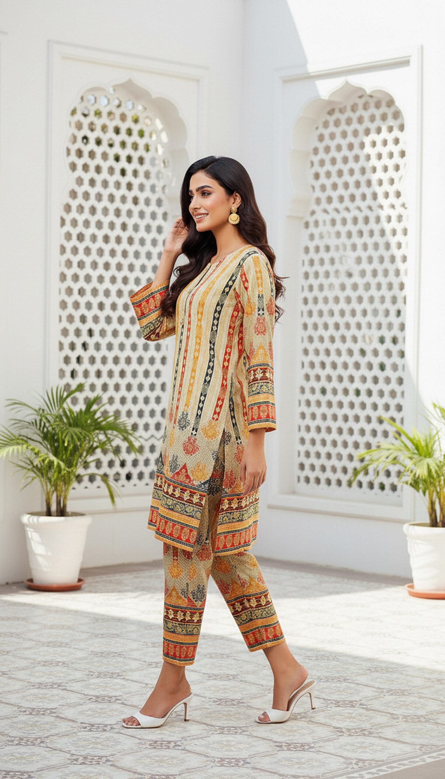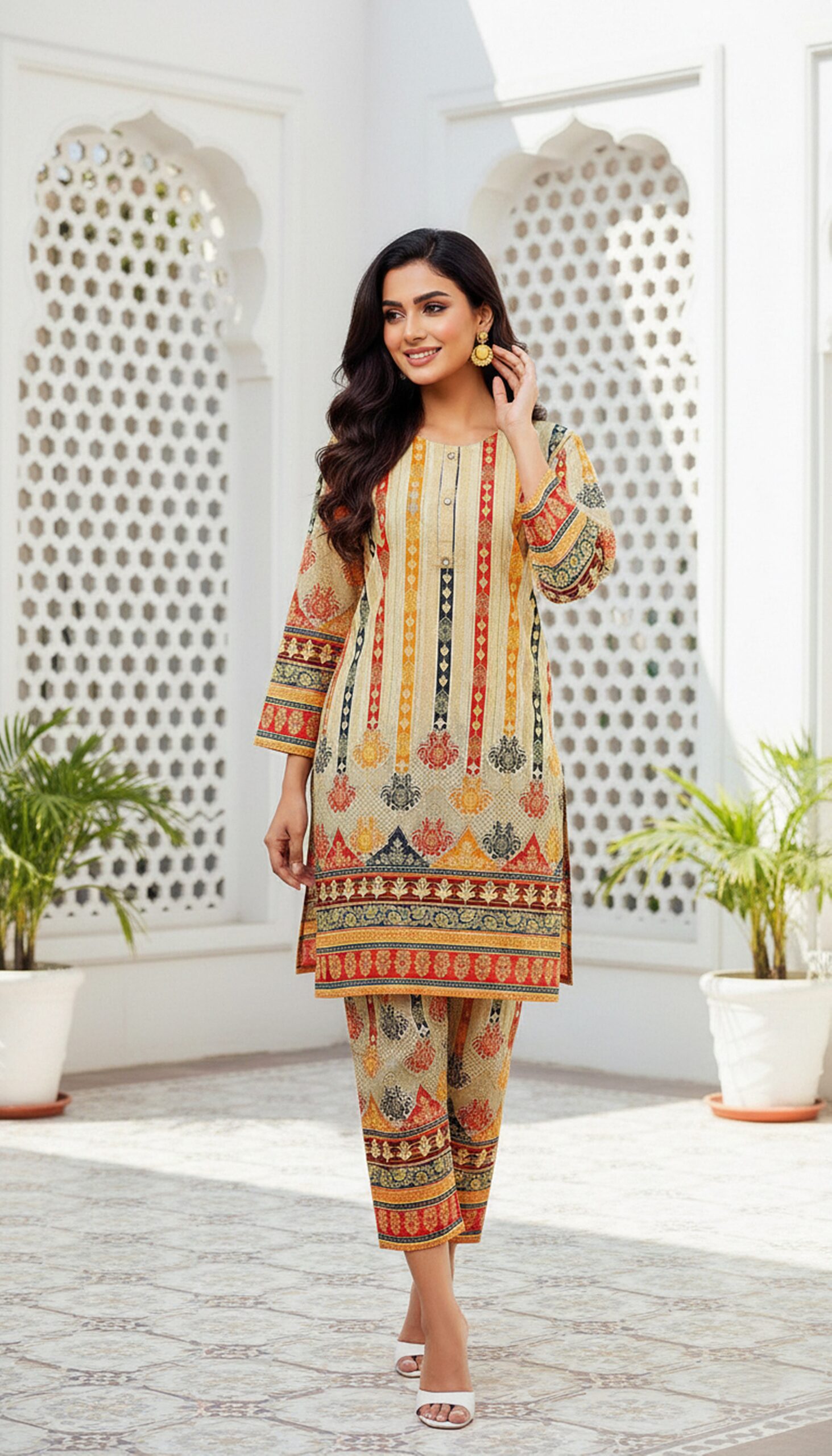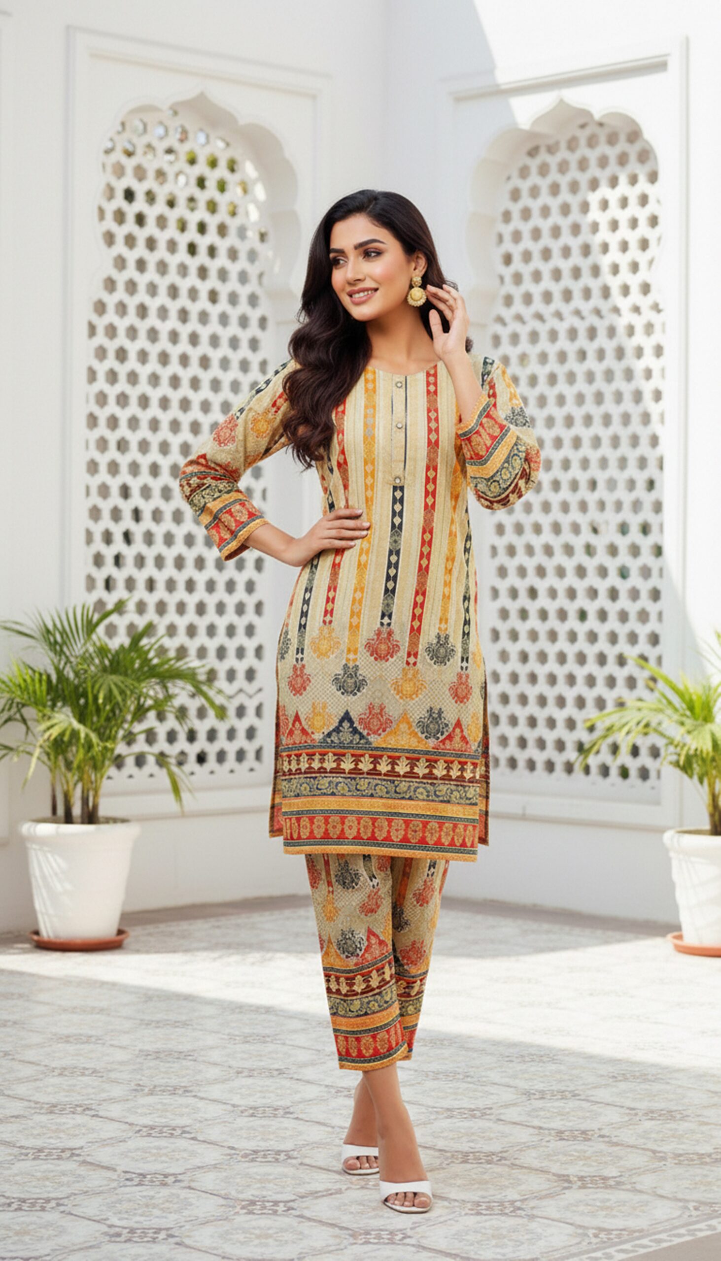 This Printed Lawn 2-piece suit in a soft beige color is the perfect blend of elegance and comfort. The shirt features a delicate, intricate print in subtle hues, adding a touch of sophistication to the timeless beige tone. Crafted from high-quality lawn fabric, it is lightweight, breathable, and ideal for warm weather. The matching trousers complete the ensemble, offering a sleek and relaxed fit that complements the shirt beautifully. Whether for casual gatherings or a laid-back day out, this set promises a stylish and chic look, perfect for any occasion.