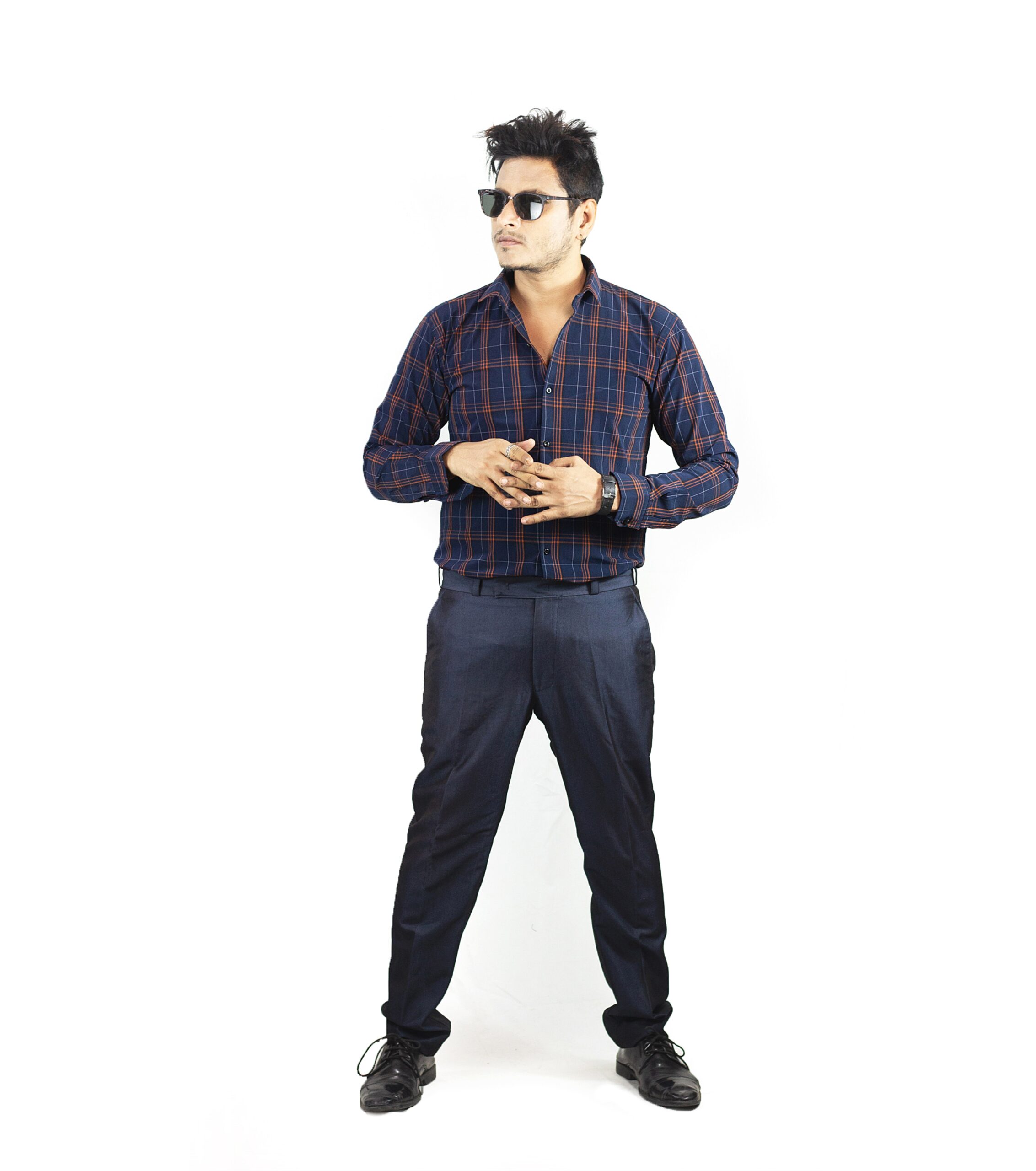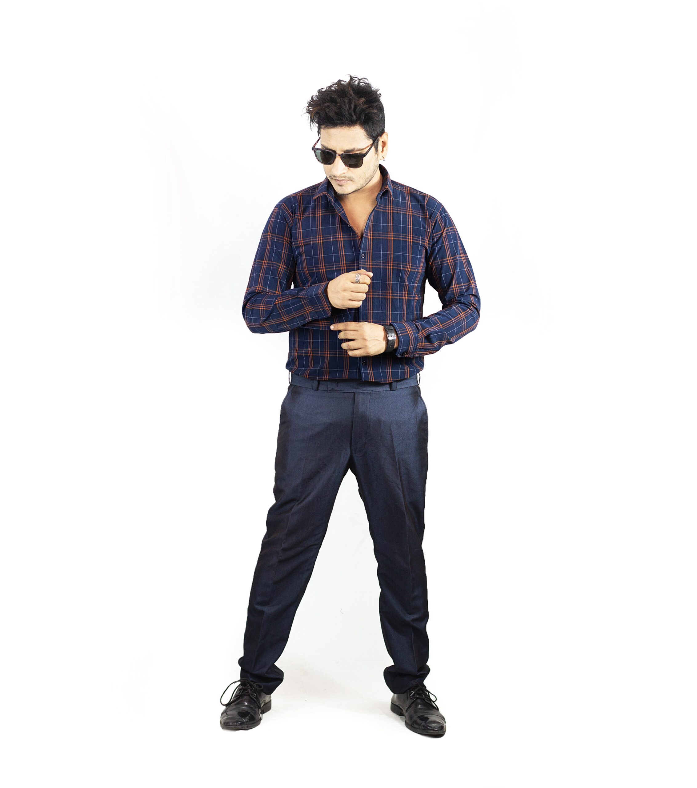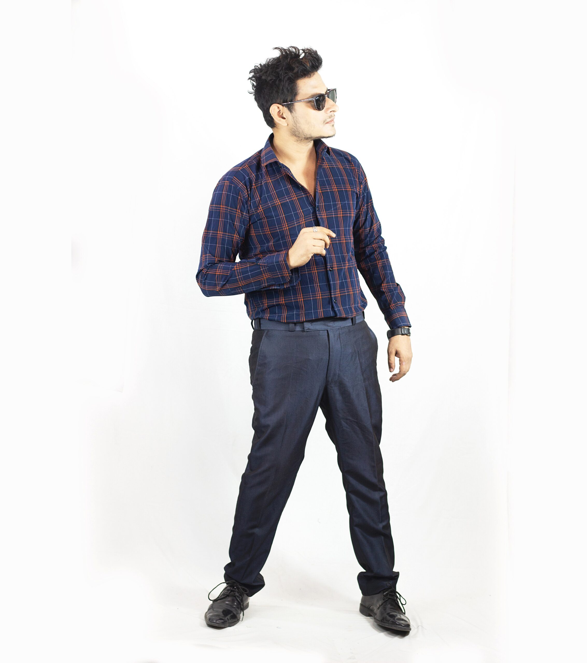 Formal Cotton Check Shirt in Navy Blue — made from thick, premium cotton with power stretch for a comfortable fit. Perfect for winter wear, it offers a soft yet structured feel, keeping you warm and stylish in formal settings.